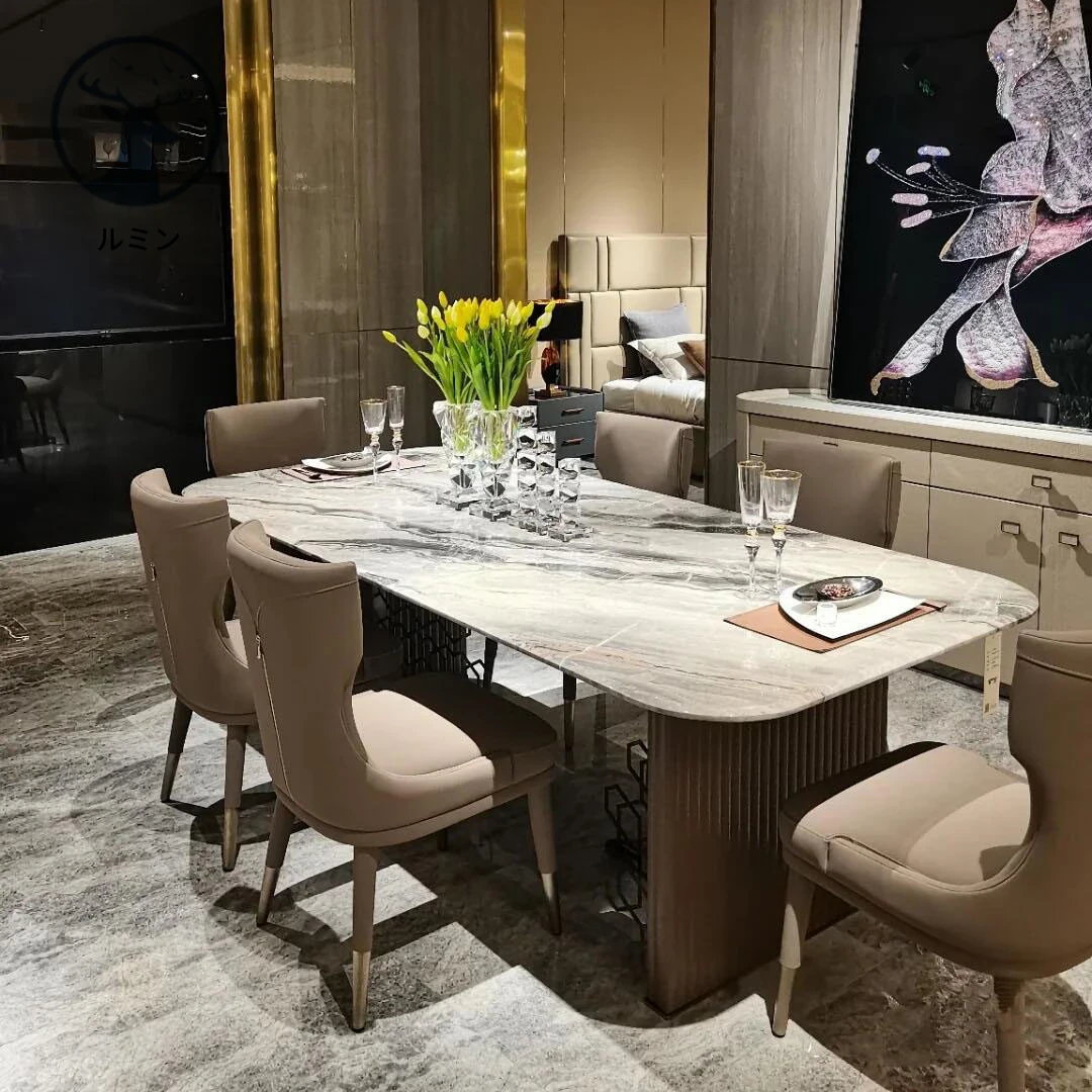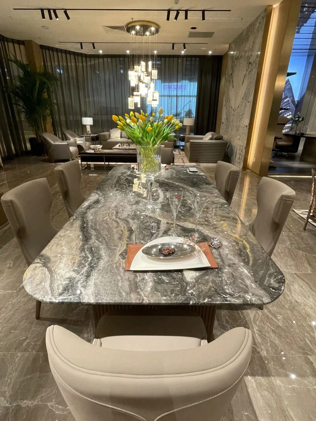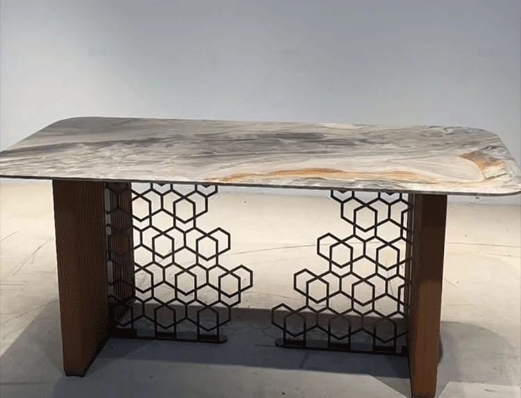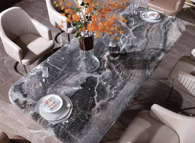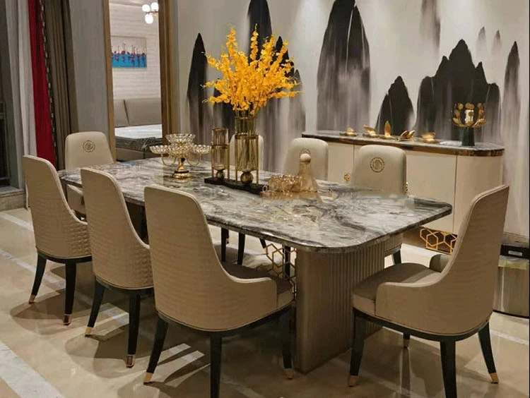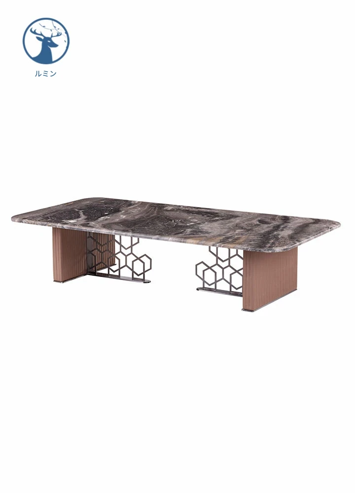 現代的ラグジュアリー感漂うステンレス製の透かし彫りデザイン、ベネチアブラウン大理石トップのロングダイニングテーブル。別荘やレストランにぴったりのテーブルと椅子のセット!洗練された空間を演出します。