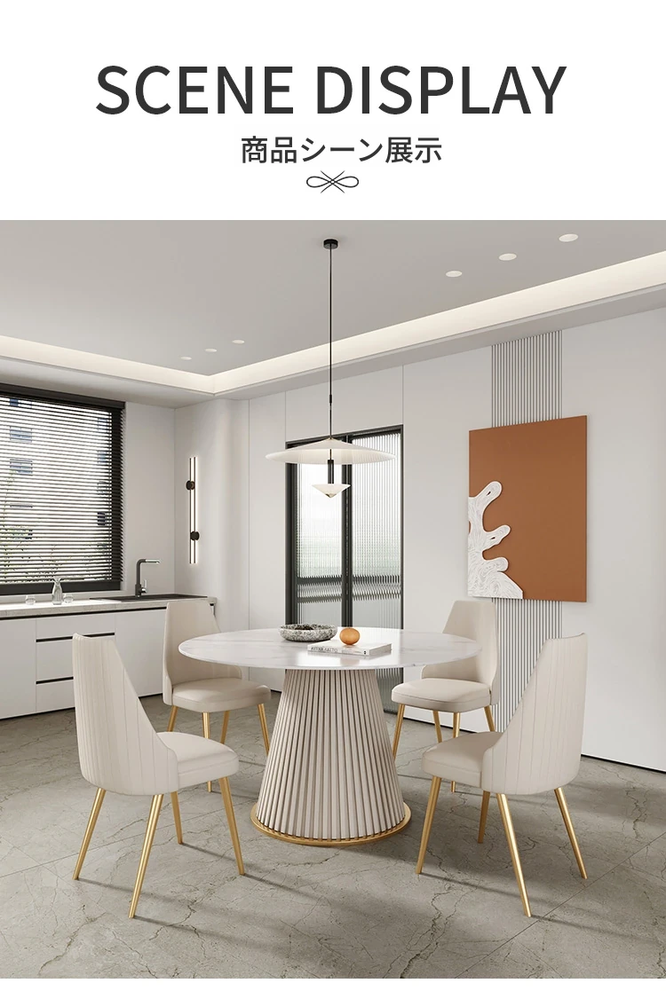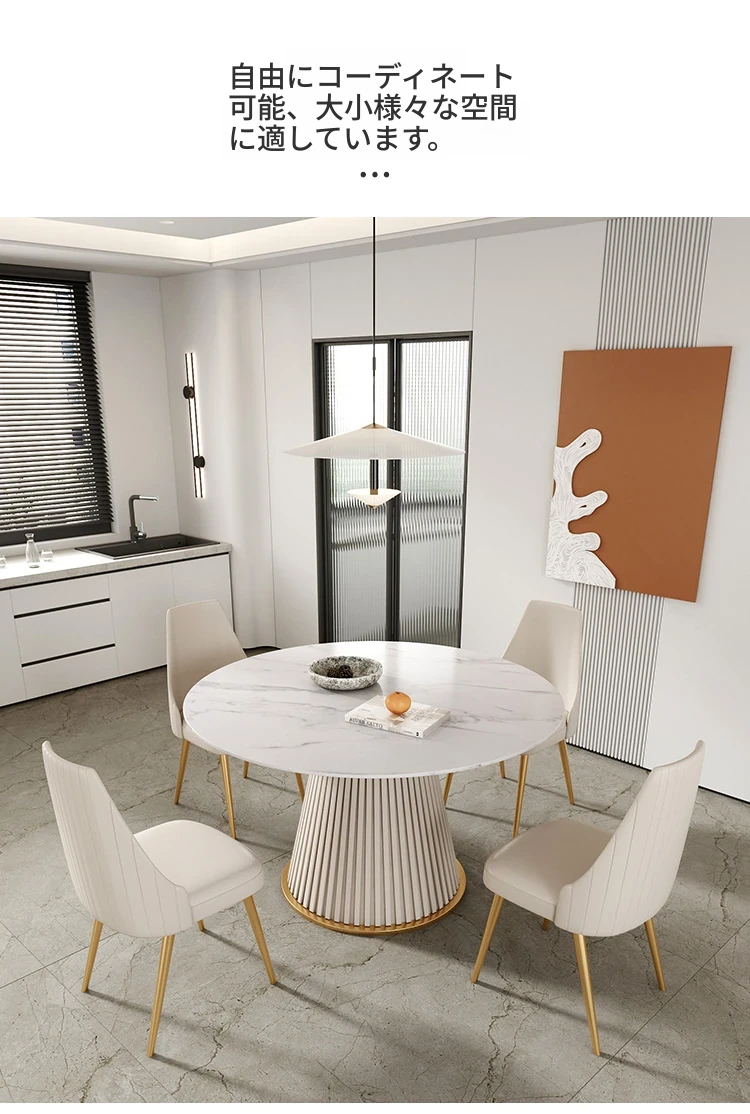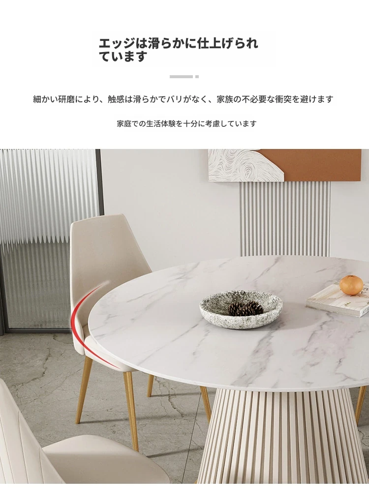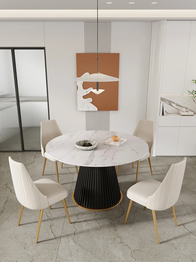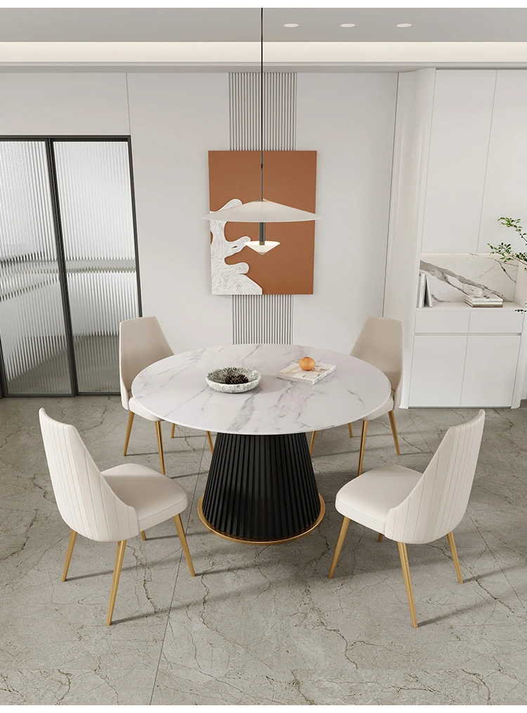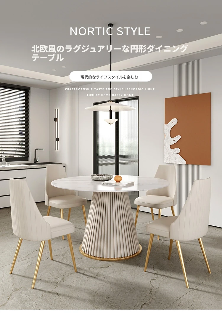 モダンでシンプルなラグジュアリー、新作グロッシーな石板製の丸型ダイニングテーブル。小スペースに最適な家庭用の石板テーブルと椅子の組み合わせ。おしゃれで機能的な食事空間を演出します!