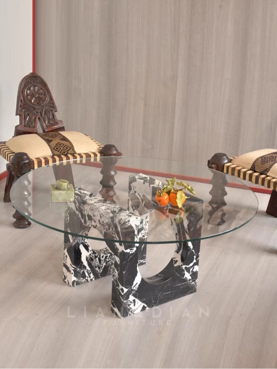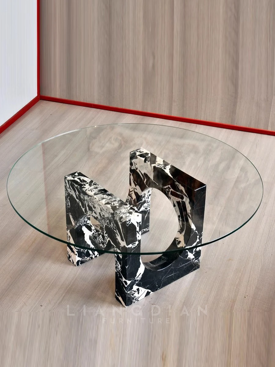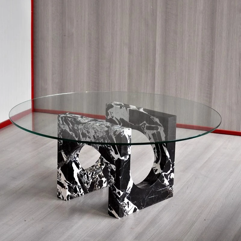 現代的ミニマリストデザイン!天然大理石のラウンドコーヒーテーブル - 小さなリビングに最適な宝格丽ブラックのシンプルなガラス円卓で、スタイリッシュな空間を演出します。