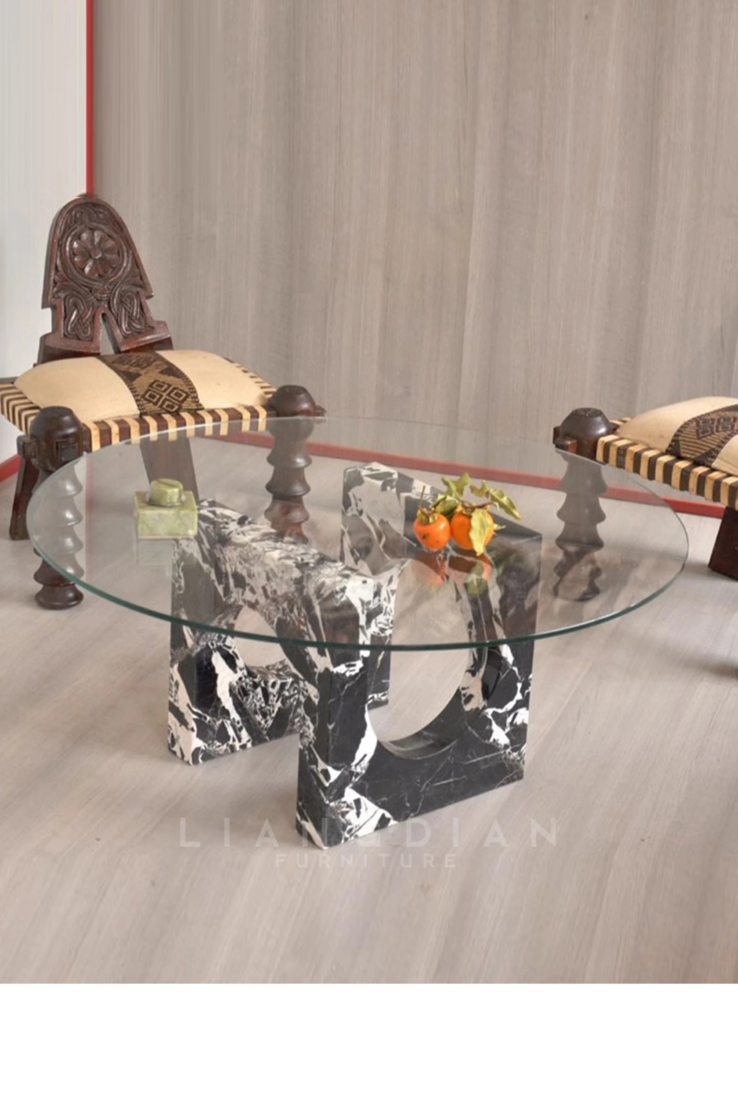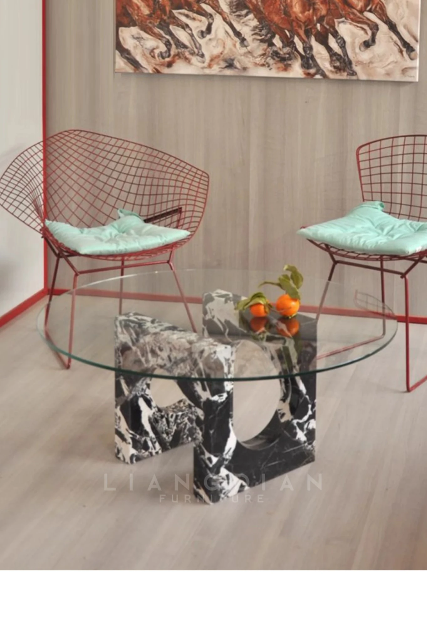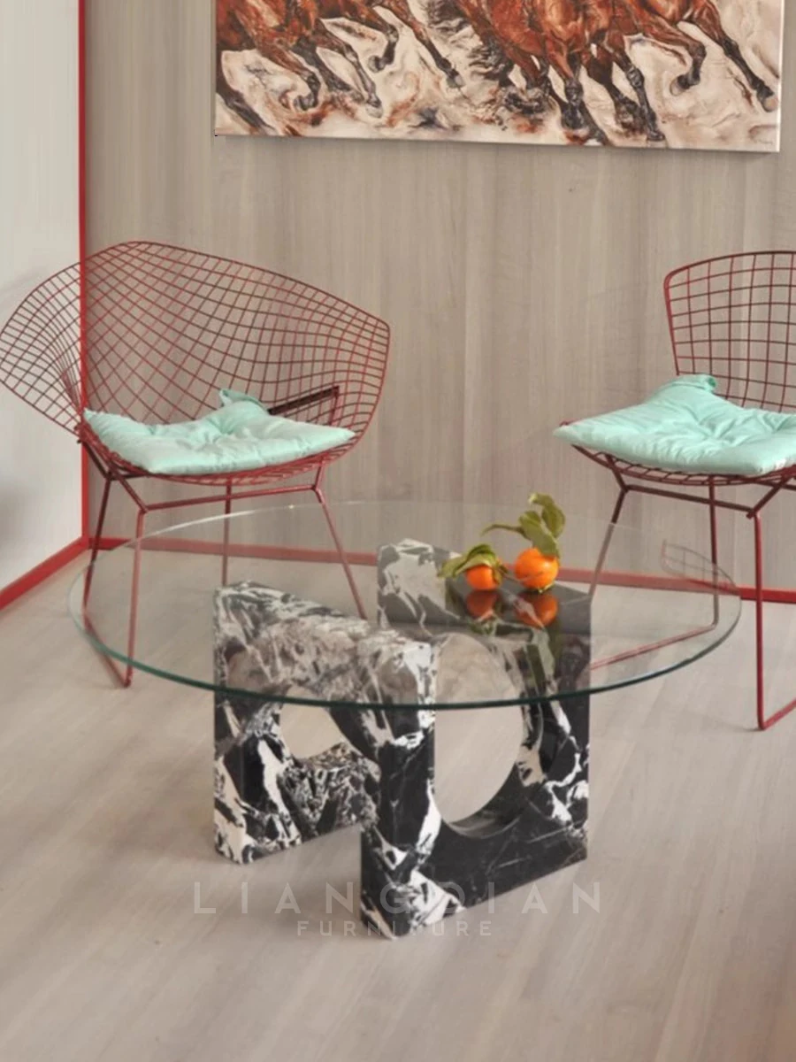 現代的ミニマリストデザイン!天然大理石のラウンドコーヒーテーブル - 小さなリビングに最適な宝格丽ブラックのシンプルなガラス円卓で、スタイリッシュな空間を演出します。