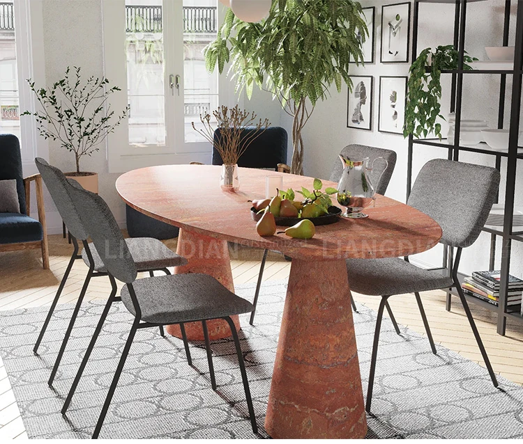 デザイナーセレクション!高級感あふれるイタリアンマーブルのしずく型ダイニングテーブル。優雅なスモーキーピンクの天然石で、豪華な別荘や広々としたリビングに最適。洗練された食卓を演出します!