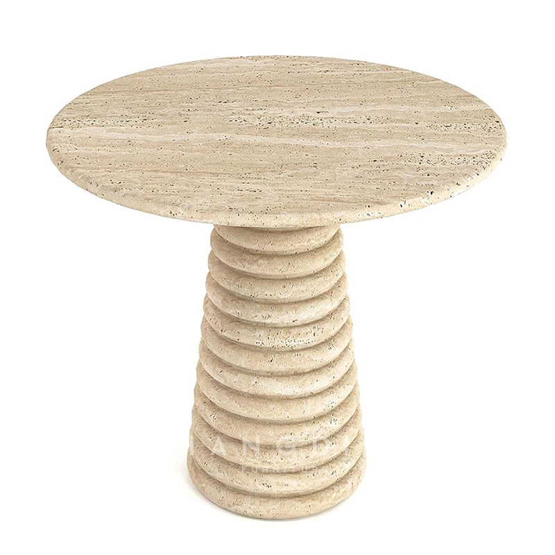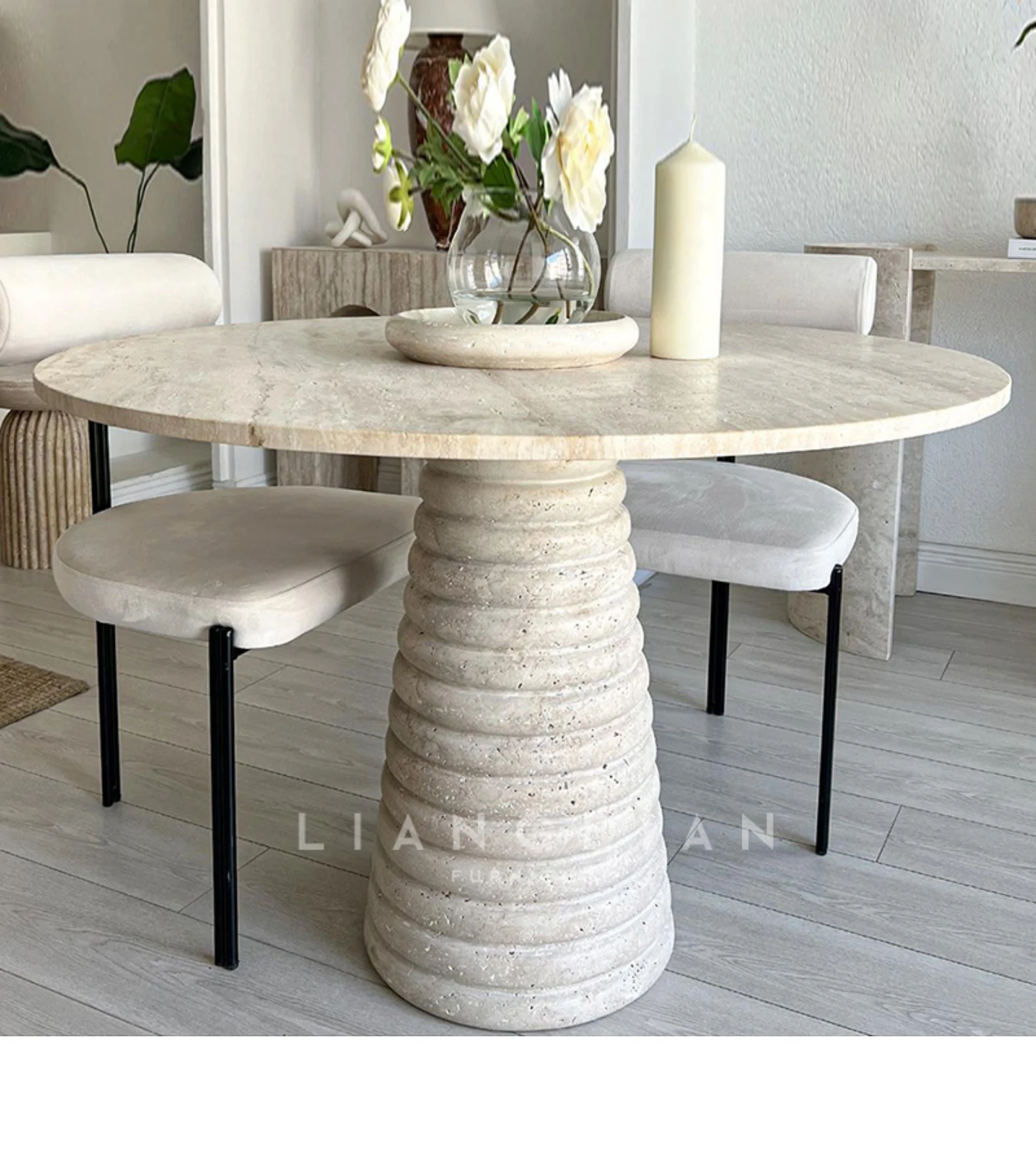天然洞石の円形ダイニングテーブル|イタリアンミニマリズムの大理石製|現代的な別荘や広々とした住空間に最適|デザイナーによる洗練された一品です。