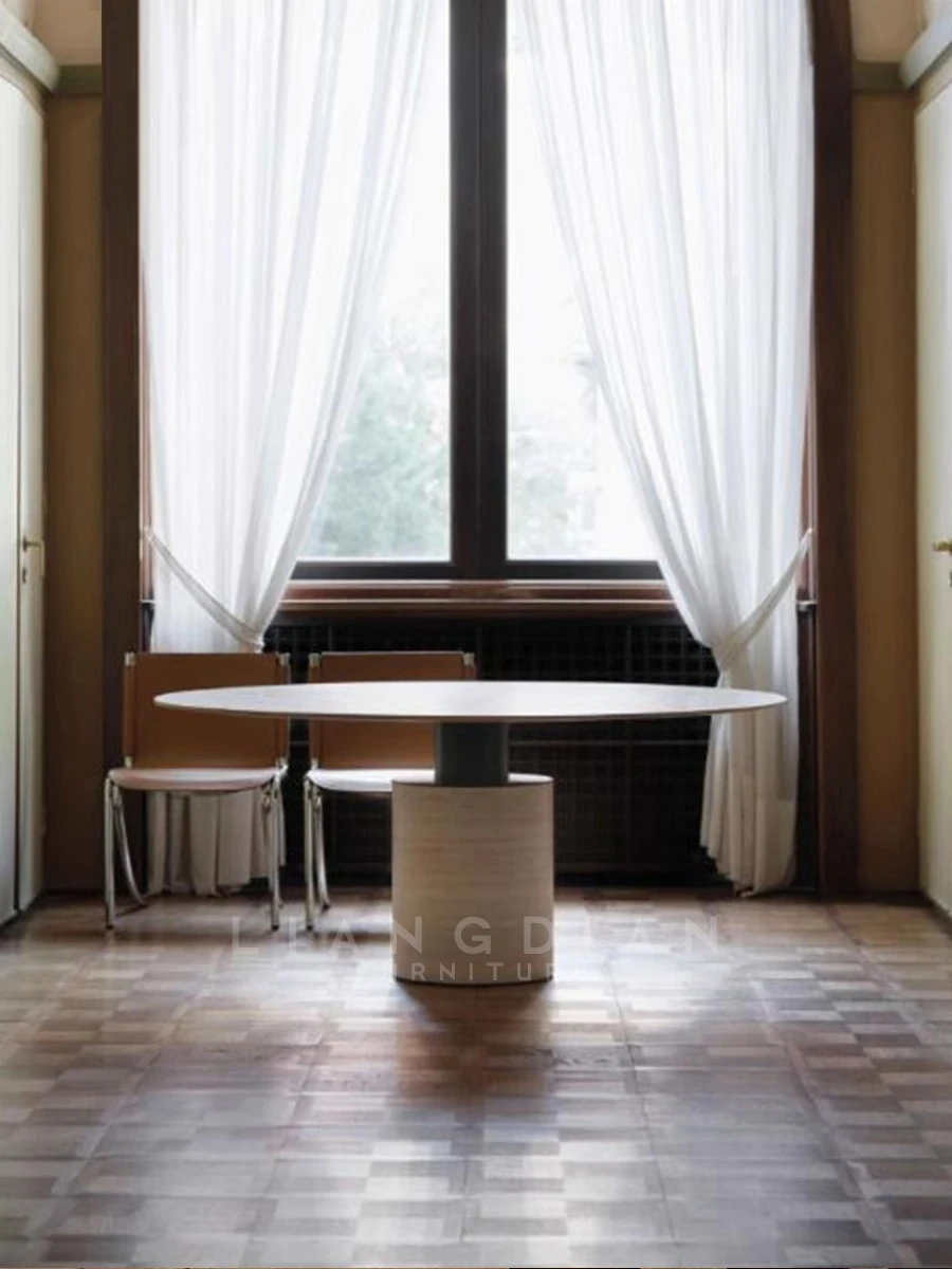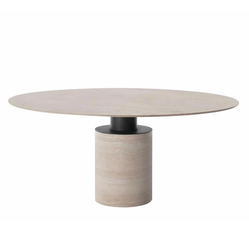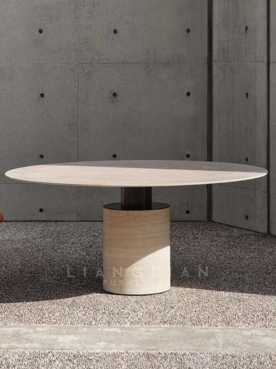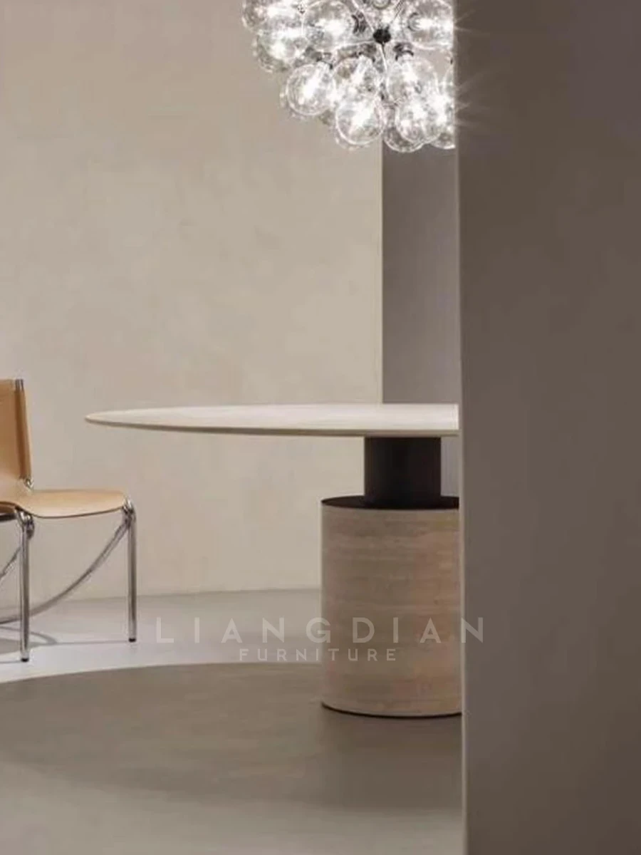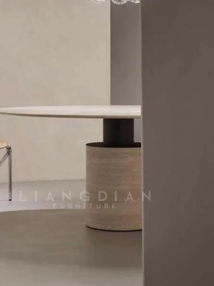 天然洞石の円形ダイニングテーブル|イタリアンミニマリズムの大理石製|現代的な別荘や広々とした住空間に最適|デザイナーによる洗練された一品です。