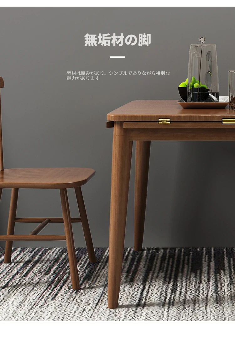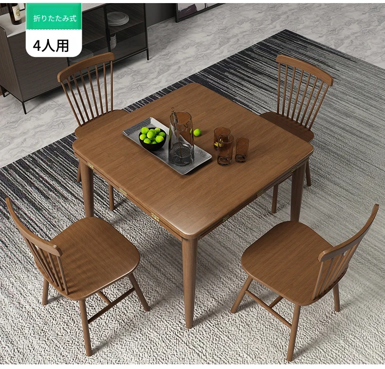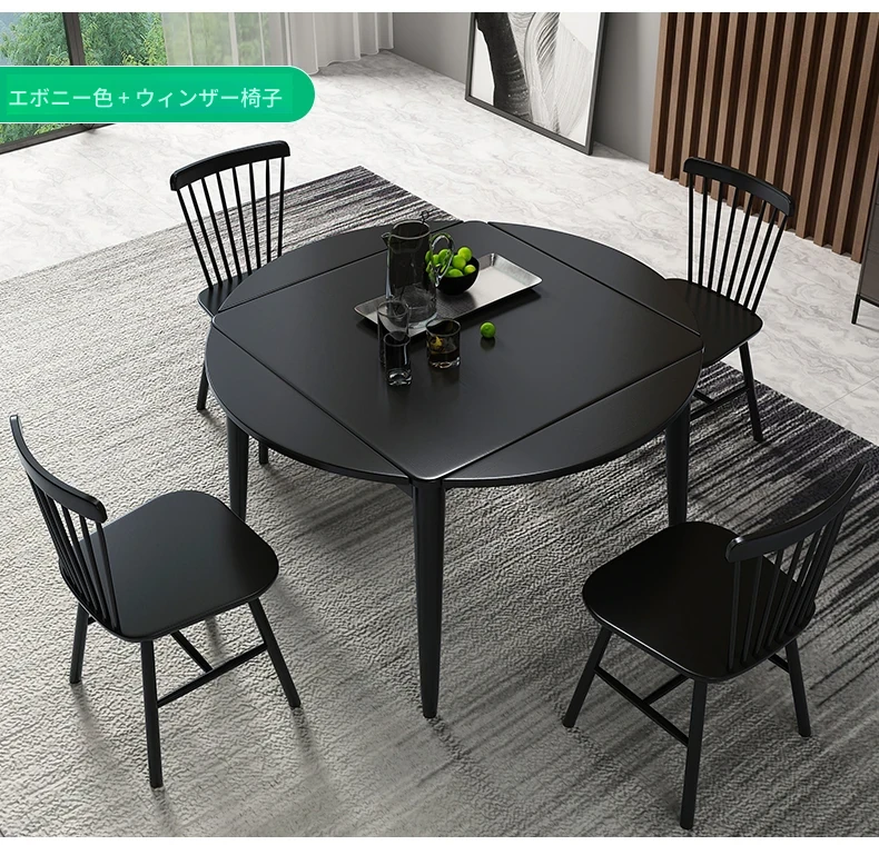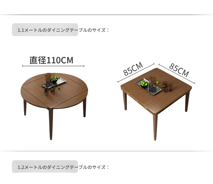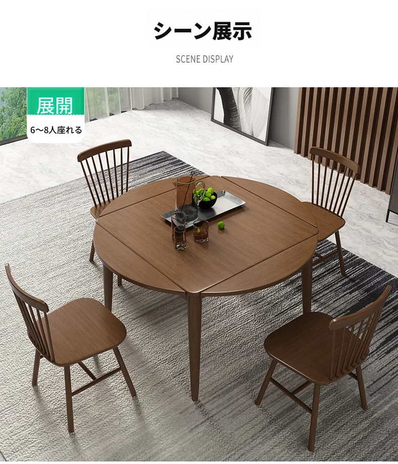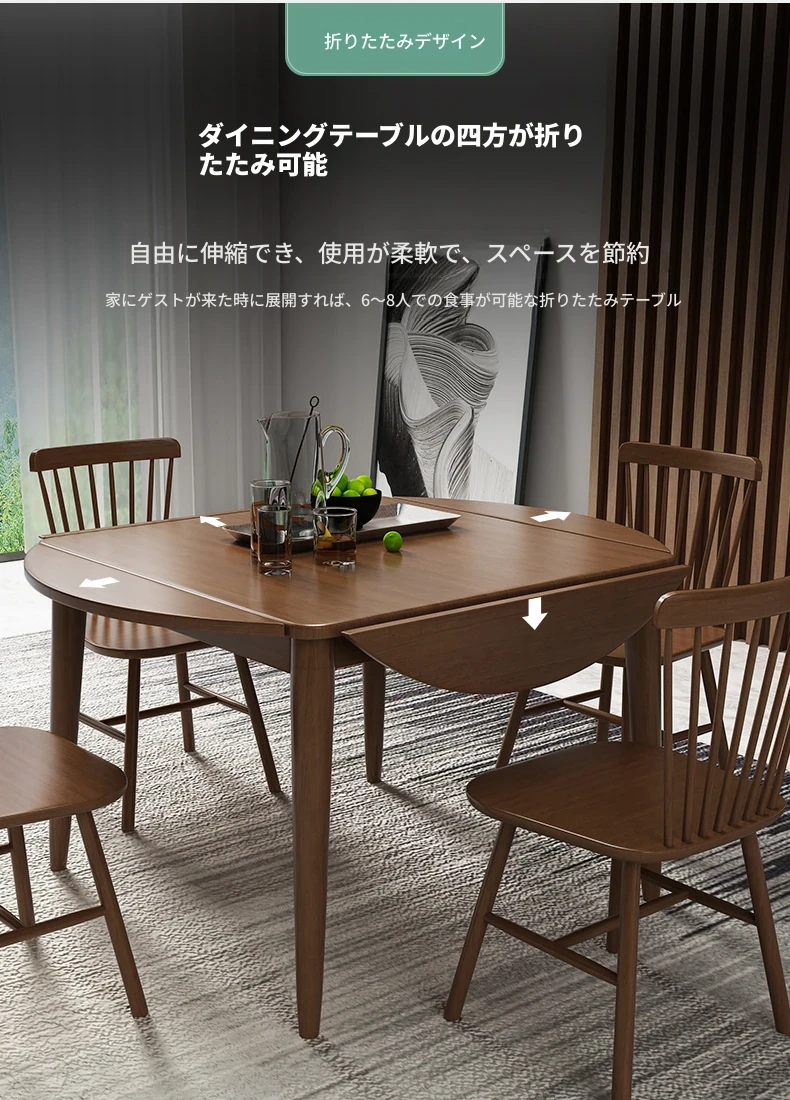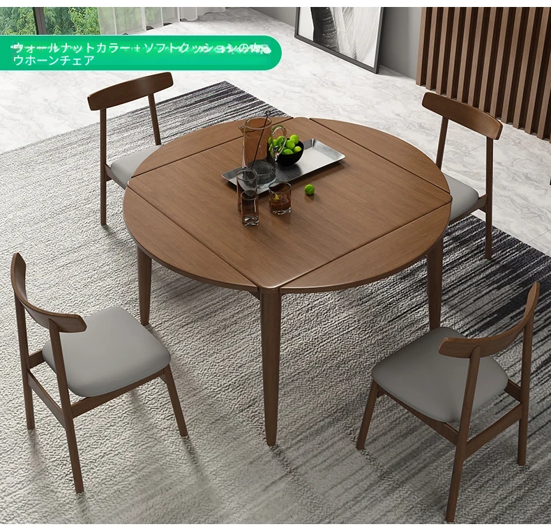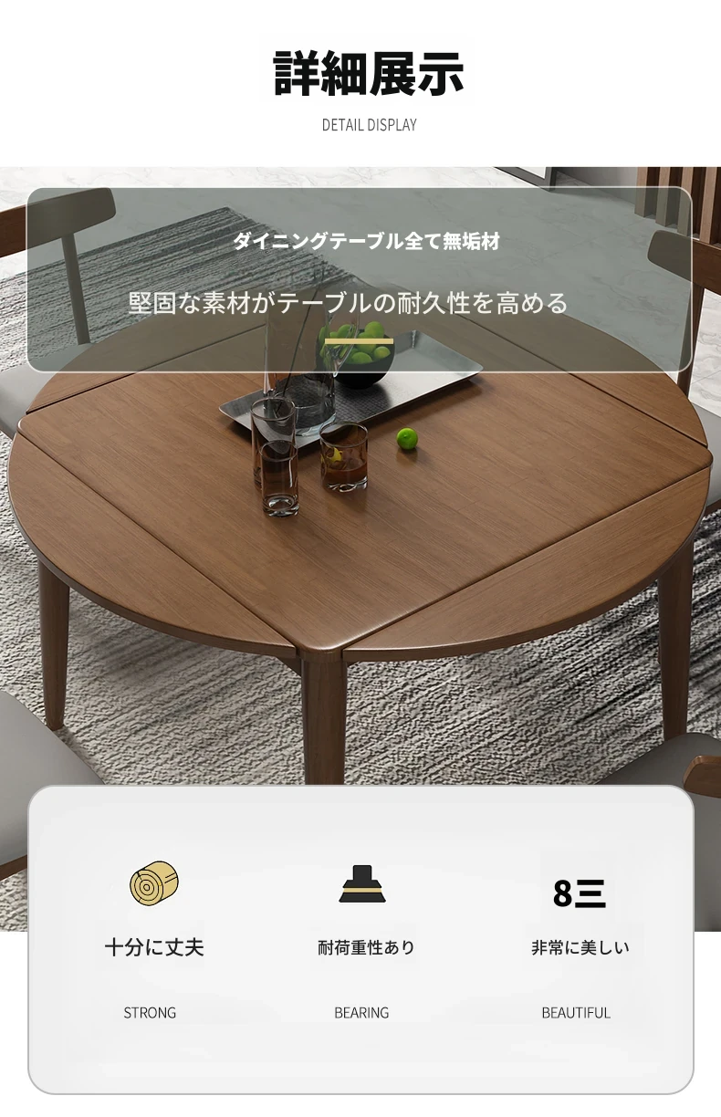 全実木折りたたみ式ダイニングテーブル!四角から丸に変身する多機能テーブル、小型住宅にもぴったりで、家族や友人との楽しい食事をサポートします。収納も簡単で、スペースを有効活用!