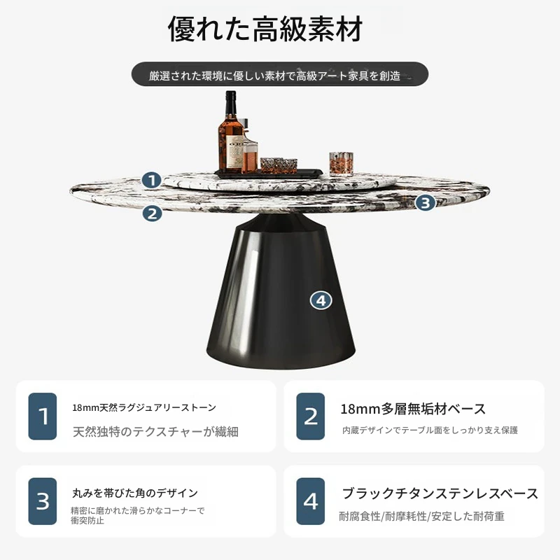 輸入された雪山飛狐天然ラグジュアリーストーン円卓+回転盤+本革ダイニングチェア*4