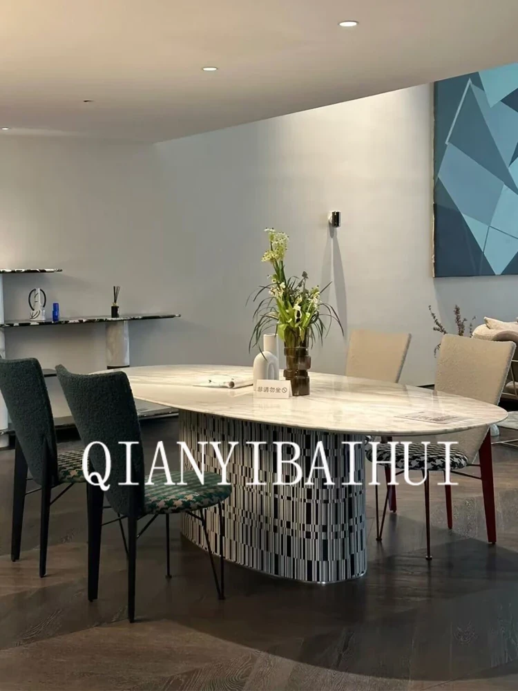 ヴィンテージアートの千鳥格子デザイン、エレガントな楕円形大理石ダイニングテーブル付き。洗練された民宿スタイルの食卓で、特別なひとときを演出。おしゃれで快適な食事空間をお楽しみください。