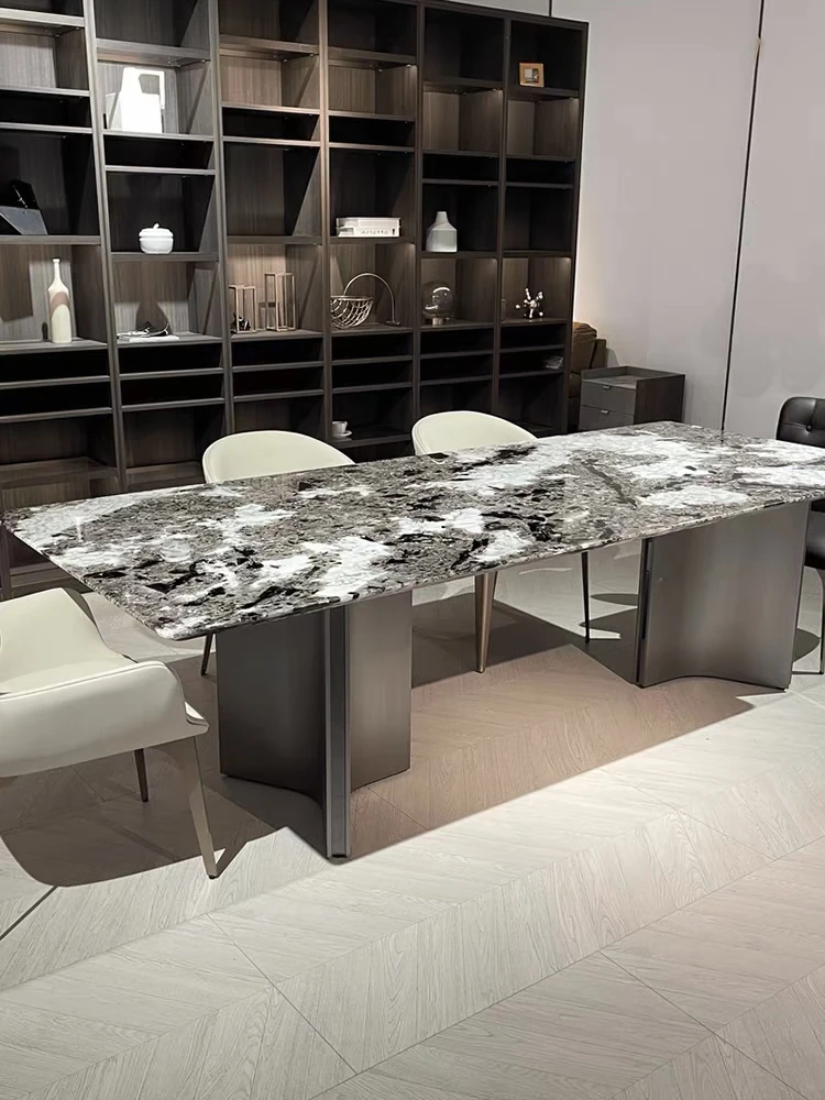 高級イタリアン天然大理石ダイニングテーブル - スタイリッシュな長方形デザイン、小型住宅にも最適!贅沢な食事体験を提供する、軽やかで洗練されたテーブルと椅子のセット。