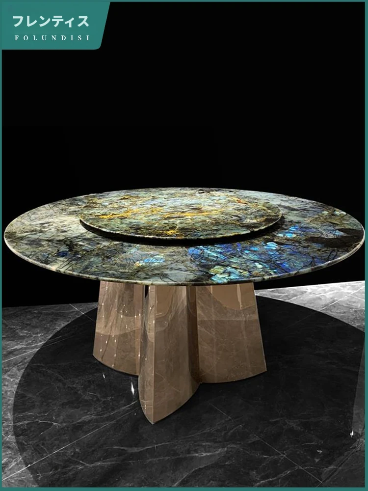 ブラジル輸入・広東省仏山産・金孔雀天然石使用のデザイナーズ軽奢高級別荘向けエレガントな長円卓。贅沢な空間を演出し、特別なひとときを提供します。