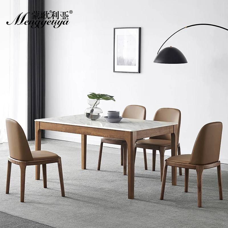 モンゴリア大理石ダイニングテーブルチェアセット - シンプルでスタイリッシュな小型長方形テーブル、家庭用の高級天然石と木材の組み合わせで、食卓を華やかに演出!