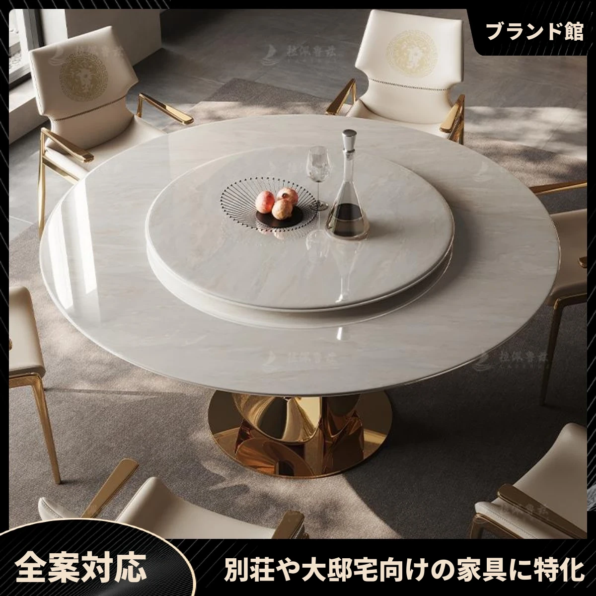 軽やかなラグジュアリー感の大理石ダイニングテーブルセット!モダンでシンプルなデザインの円形テーブルに回転式プレート付き。快適な椅子と共に、家庭での特別な食事時間を演出します。