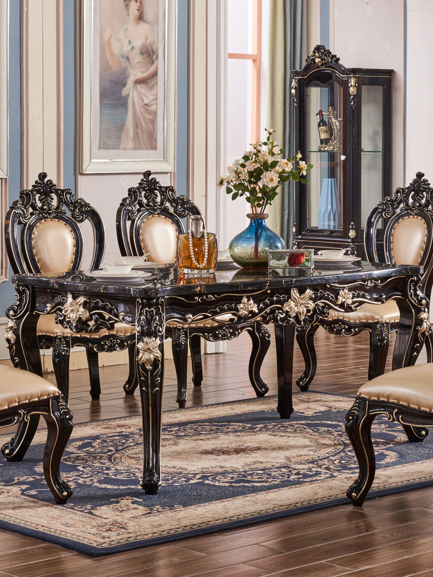 ヨーロピアンスタイルの無垢材ダイニングテーブルセット - ヴィンテージ彫刻と大理石仕上げの長方形テーブル、家庭用レストラン家具、エレガントな黒檀色で、特別な食事のひとときを演出します。