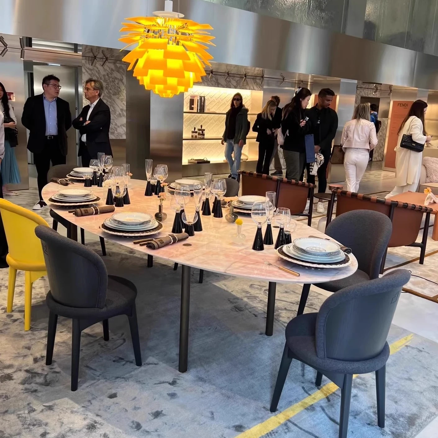 アーティストブランドFendiのトト粉色大理石エラプス型ダイニングテーブル - フレインイスタイルのロングテーブルで、洗練された美しさと快適な食事体験をお楽しみください。