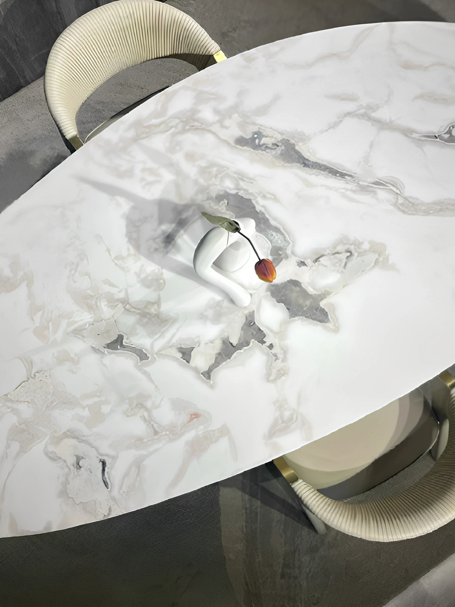 イタリアンナチュラルローマ洞石ダイニングテーブル - モダンミニマルデザインのサンプルルーム用別荘レストラン向けエレガントな楕円形ロングテーブルで、優雅な食事体験を提供します!