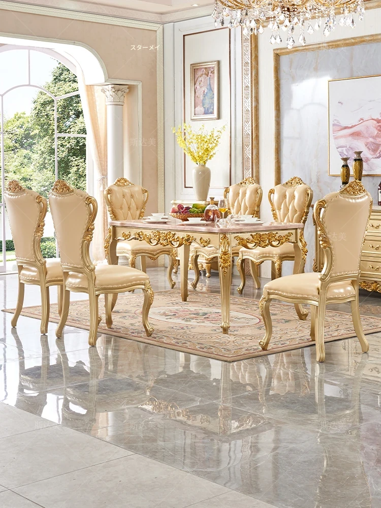 エレガントな欧風デザインの実木製方形ダイニングテーブル、豪華なシャンパンゴールドと大理石の組み合わせ。洗練されたレストランスタイルのテーブル&椅子セットで、特別な食事体験を演出します。
