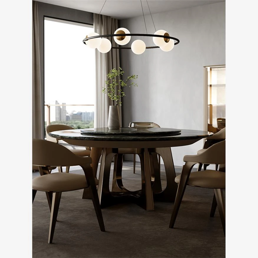 豪華な欧風デザイン!全実木製のマーブル円卓と赤檀色の椅子のセット - 高級ヴィラやレストランに最適なラウンドダイニングテーブル!